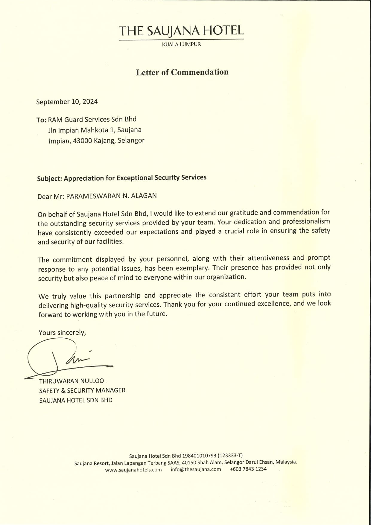 Letter of Commendation for Excellent Services